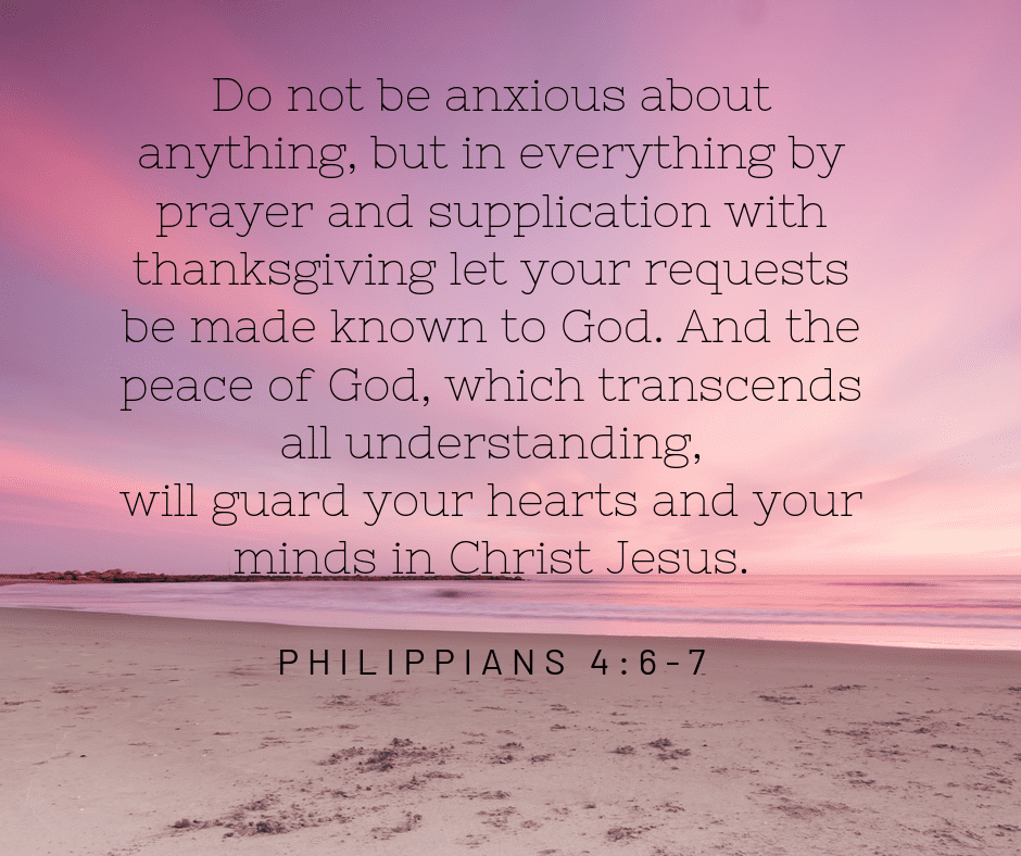 Philippians 4:6-7 ESV: do not be anxious about anything, but in everything by prayer and supplication with thanksgiving let your requests be made known to God. And the peace of God, which surpasses all understanding, will guard your hearts and your minds in Christ Jesus.